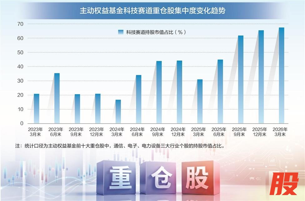 随着2026年公募基金一季报披露完毕,基金持仓高度“抱团”于科技赛道的现象成为市场焦点。具体来看,主动权益基金的前十大重仓股高度集中于中际旭创、新易盛、东山精密、宁德时代等个股,它们分属通信、电子、电力设备行业。这些龙头公司在基金前十大重仓股中的合计市值占比(即“重仓股集中度”)高达67.42%,创下历史纪录。